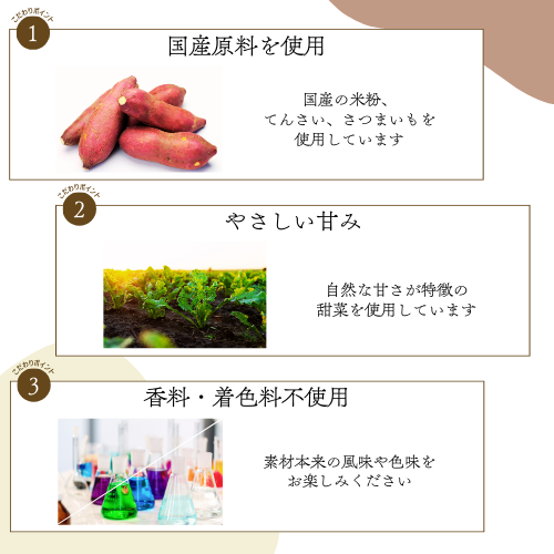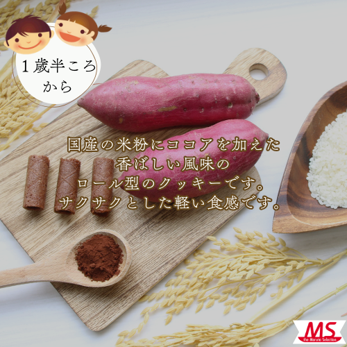 | 使用原材料 | 米粉(米(国産)、砂糖(てんさい(国産)、さつまいもペースト、食用こめ油、ココアパウダー / 炭酸カルシウム 、ピロリン酸第二鉄 |
