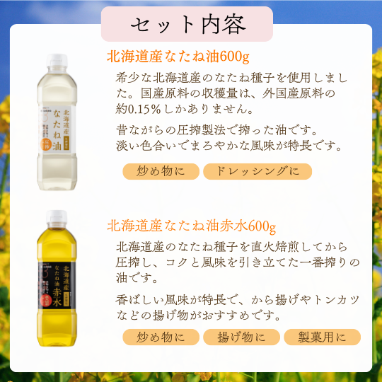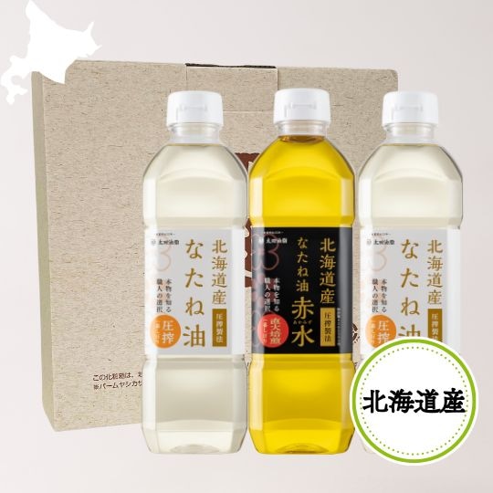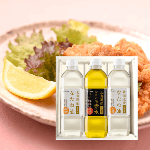 | ギフトセット内容 | 北海道産なたね油 600g×2本、北海道産なたね油赤水 600g×1本 ※レシピ付き |