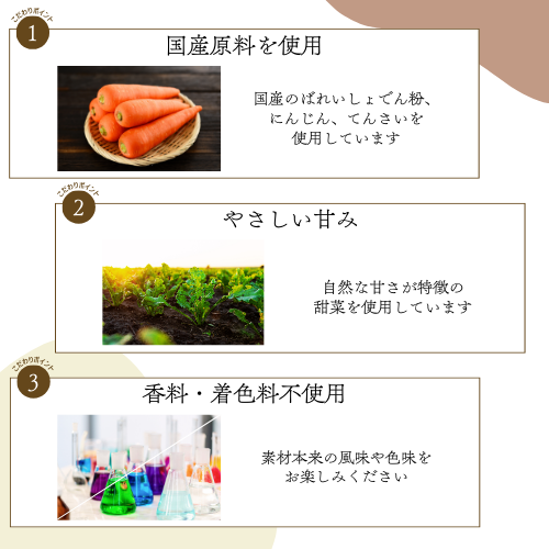 素材そのままの風味をお楽しみいただけます。おやつの種類により、賞味期間は異なりますが、シンプルな原材料を使用しているため、商品お届け後はお早めにお召し上がりください。