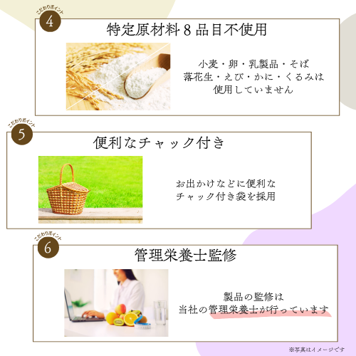 パッケージの表面に、おやつに使用しているすべての原材料を記載しており、裏面の表示を確認する手間がかかりません。