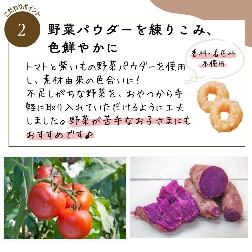 トマトと紫いもの野菜パウダーを使用し、素材由来の色合いに!