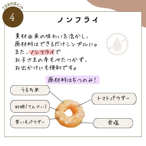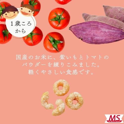 国産お米に、紫いもとトマトパウダーを練り込んだ、軽く食感の良いパフです。