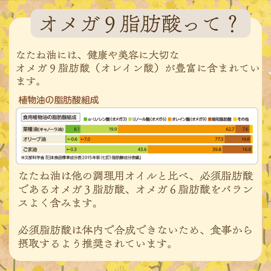 オメガ9脂肪酸(オレイン酸)は、健康や美容に大切な成分で、人の体内で合成できる一価不飽和脂肪酸です。なたね油に豊富に含まれています。酸化しにくく安定性の高いオイルのため、揚げ物や炒め物など加熱料理に最適です。なたね油は他の調理用オイルと比べ、必須脂肪酸であるオメガ3脂肪酸、オメガ6脂肪酸をバランスよく含みます。必須脂肪酸は、体内で合成できないため、食事から摂取するように推奨されています。