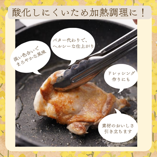 淡い色合いでまろやかな風味を持つ油です。酸化しにくく安定性の高いオイルのため、揚げ物や炒め物など加熱料理に最適です。