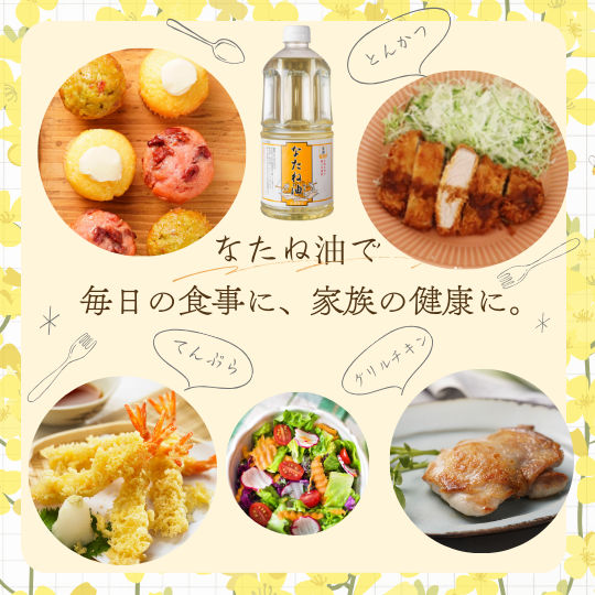 旬のお野菜を使用したサラダに、ドレッシングとしてご使用いただくのもおすすめです。脂溶性ビタミン(ビタミンA、ビタミンD、ビタミンE、ビタミンK)は、オイルと一緒に食べることで、体内への吸収率がアップします。ビタミンは旬の野菜に多く含まれます。 なたね油とポン酢を「1:1」と同じ分量で混ぜるだけで、即席和風ドレッシングのできあがり!ごま、大葉、生姜、大根おろしなどをプラスしてアレンジできます。