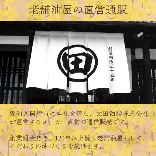 圧搾製法とは、なたねなどの油分の多い植物から、圧力をかけて油を取り出す製法です。どんなに便利な時代になっても、すべてを機械に頼らず、ひとつひとつ、丁寧に油しぼりを続けています。