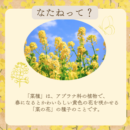 アブラナ科の植物で、春になるとかわいらしい黄色い花を咲かせる「菜の花」の事です。なたね油は、「菜の花」の種から搾った油です。