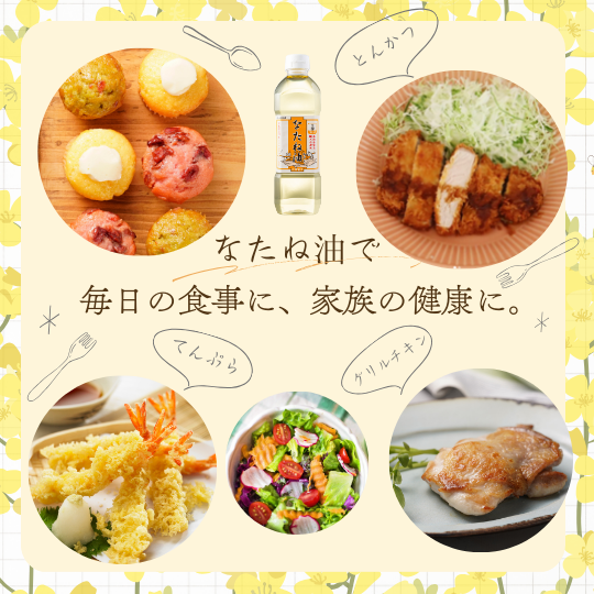 旬のお野菜を使用したサラダに、ドレッシングとしてご使用いただくのもおすすめです。脂溶性ビタミン(ビタミンA、ビタミンD、ビタミンE、ビタミンK)は、オイルと一緒に食べることで、体内への吸収率がアップします。ビタミンは旬の野菜に多く含まれます。 なたね油とポン酢を「1:1」と同じ分量で混ぜるだけで、即席和風ドレッシングのできあがり!ごま、大葉、生姜、大根おろしなどをプラスしてアレンジできます。