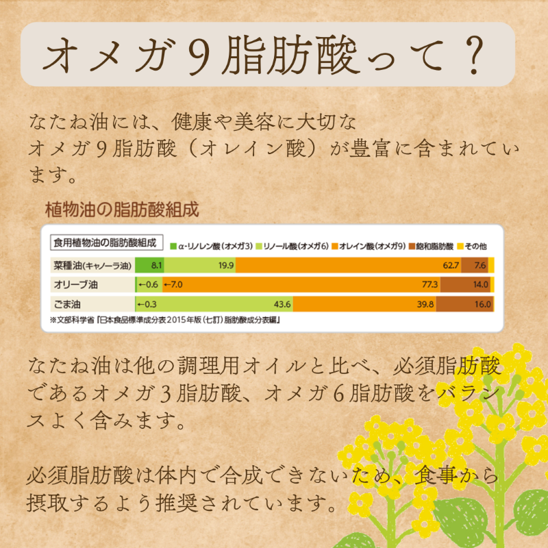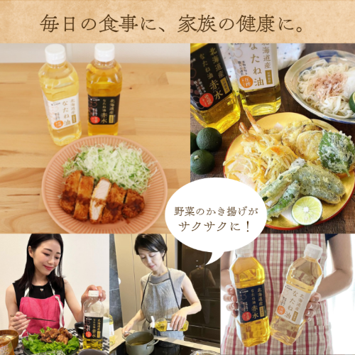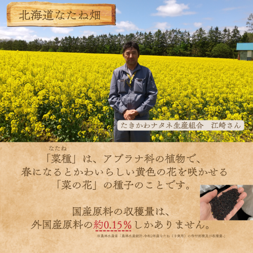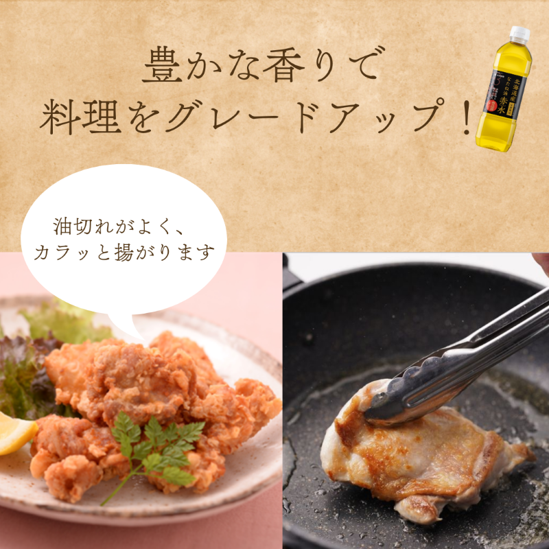 北海道産の菜種を直火焙煎してから圧搾しコクと風味を引き立てた一番搾りの油です(特許取得)香ばしい風味があり、トンカツやから揚げにおすすめです。サラッと揚がる油切れの良さがあり、美しいキツネ色に揚がります。