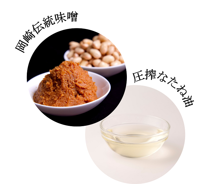 2.岡崎伝統の味噌使用(味噌に占める割合:合資会社八丁味噌の味噌50%、株式会社まるや八丁味噌の味噌50%使用)