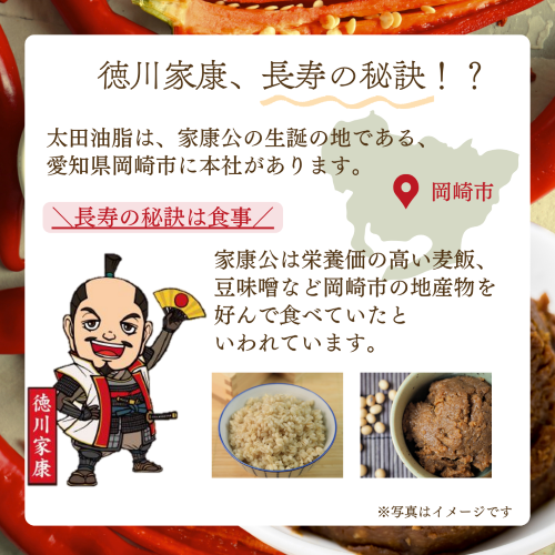 太田油脂は、家康公の生誕の地である、愛知県岡崎市に本社があります。家康公は長寿としても有名で、その秘訣は食事にあったといわれ、栄養価の高い麦飯、豆味噌など岡崎市の地産物を好んで食べていたといわれています。家康公が愛し、長寿の秘訣ともいわれた岡崎の伝統味噌を使用した「おかざきおかず味噌」をご用意しました。