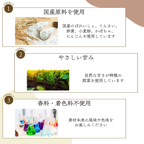 | 使用原材料 | ばれいしょでん粉(ばれいしょ(国 産))、砂糖(てんさい糖)、卵黄 (卵を含む)、小麦粉、脱脂粉乳、か ぼちゃ粉末、にんじん粉末 |